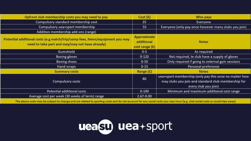 UEA Boxing Club is a competitive club for all ability levels. Running two campus sessions (Wednesdays and Sundays), and two off-campus sessions at Attleborough Boxing Club (Mondays and Thursdays). We aim to bring together both casual and committed boxers, whatever their interest - whether that be competing, improving their fitness or self-defence. We offer the opportunity to be carded and compete in amateur bouts through our parent club Attleborough Boxing Club. As a club we also offer the chance to represent us in BUCS. We have performed well in recent years and we would love to send more members to represent us! As well as training and competing, we are all about community spirit and foster this with socials, trips and events. All you need to bring is yourself, appropriate sportswear, water and a good attitude; everything else will be provided. As you progress you will need to provide your own hand wraps and a gum shield.